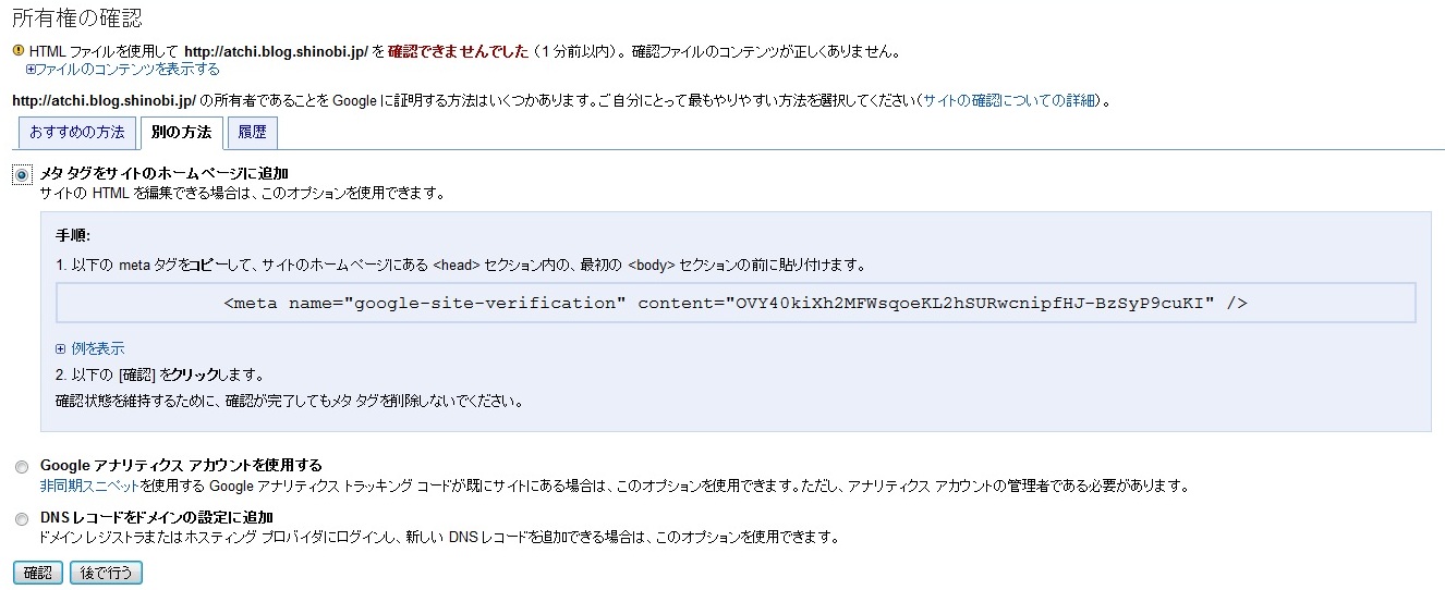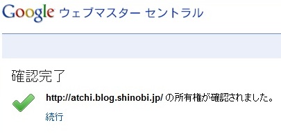 ④Googleの所有権の確認画面で確認ボタンを押す。