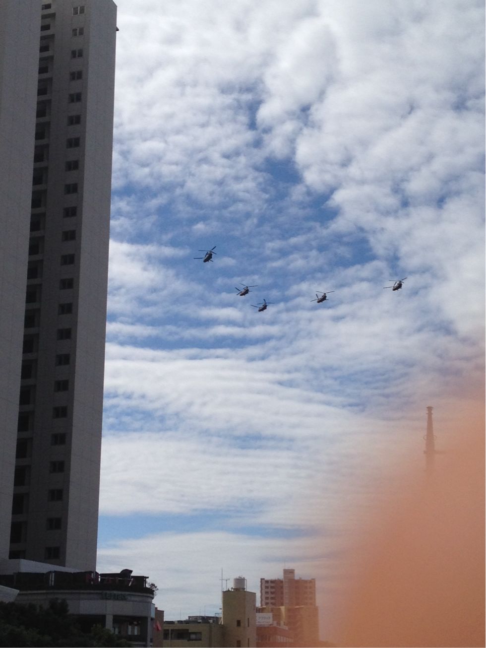 区役所から自宅に戻る途中、爆音がするので空を見上げたところ、V字型に編隊飛行をしている自衛隊らしきヘリコプターを5機見つけた。