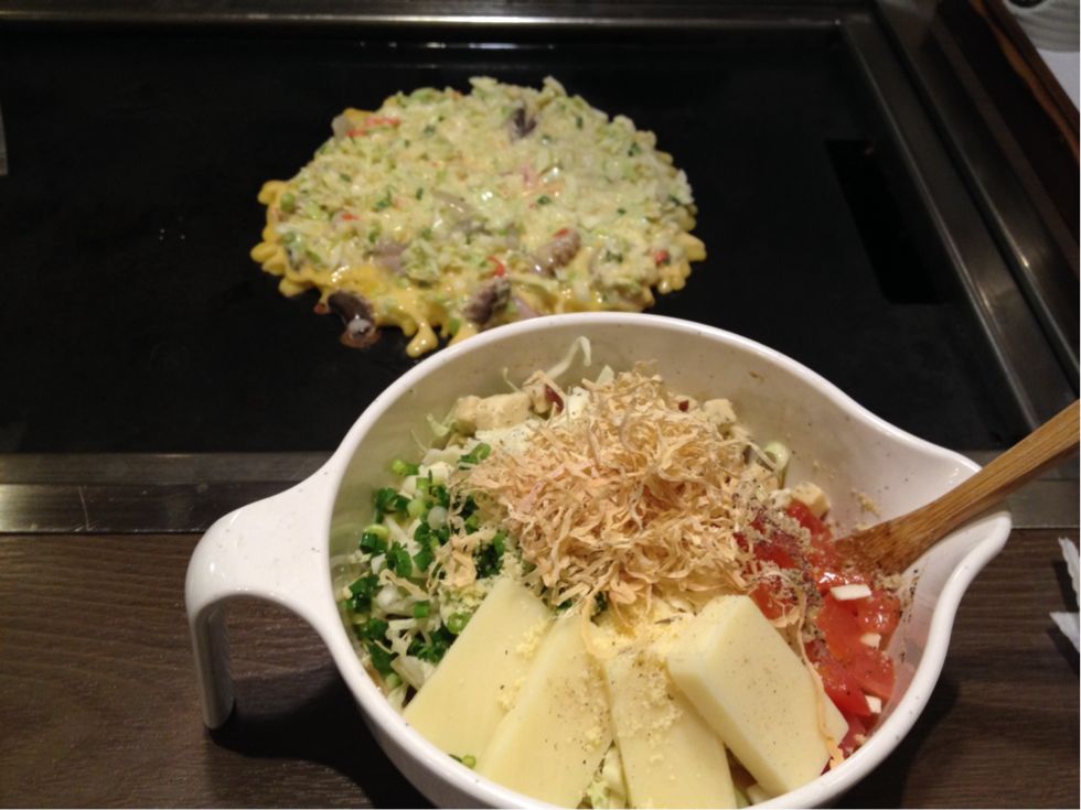 それぞれ作り方が各テーブルにあるので、初めてでもなんとかなった。ちなみにもんじゃは過去に2回しか経験がなく、いずれも他人にやってもらっていたので、結構ドキドキものだった。